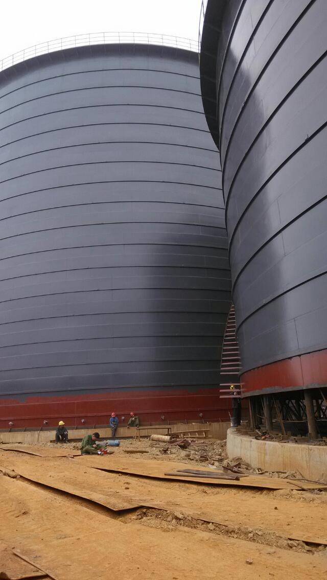 2. 结构形状及尺寸:大型钢板仓属于大型薄壁容器,高径比一般在1:1左右。仓体为圆柱形,仓顶为球缺形的圆形仓仓。仓壁采用钢板焊接(搭接、对接焊)而成;其球缺状仓顶半圆体,是通过定型钢材的结构设计和多个拱形梁的组合,形成了独特结构建筑,其合理的建筑结构使其圆顶具有可靠的承载能力。